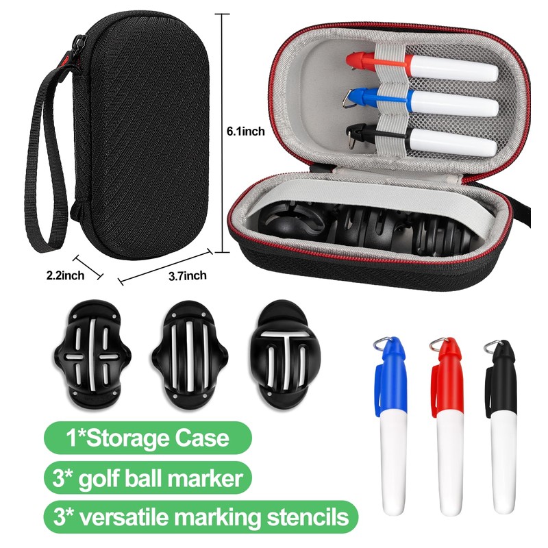 - WHAT YOU CAN GET: Comes with 3*semi-sphere golf ball line stencils, 3* golf ball markers (black + blue + red), and a compact storage case which can neatly storage all the golf ball marker tools easily, NOTE: golf balls are not included