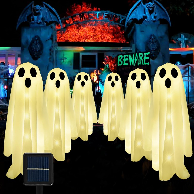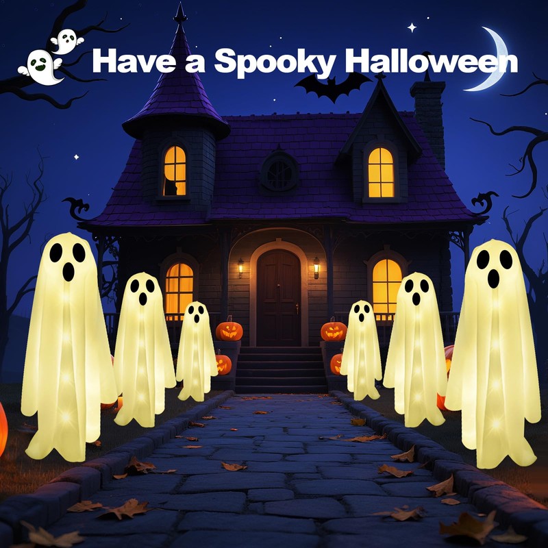 - 【Perfect Halloween Solar Light Set】This set includes 6 white light up ghost decorations, 6 light poles, and a solar panel with bracket. These light up ghost are incredibly easy to install—perfect for gardens, yards, pathways, and more. Create a spine-tingling Halloween atmosphere with these glowing ghost decorations that will delight kids, family, and friends at your Halloween party!