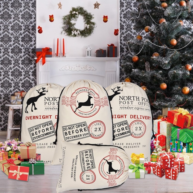 - A large canvas Santa sack with drawstrings for your Christmas presents. perfect in front of your fireplace or christmas tree this holiday season! Christmas Gift Bags add fun and excitement to Christmas parties with these festive designs of holiday party favor bags. Pack your holiday gifts in our drawstring canvas sacks, add candies or large toys. Wrap your gifts like Santa and spread the Christmas spirit during Christmas parties!