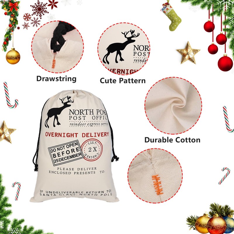 - SANTA BAG Measures:27.5inchX19.5inch; 6PCS in the package. This Christmas sack is made of 100% cotton. Super durable and designed to handle heavyweight.