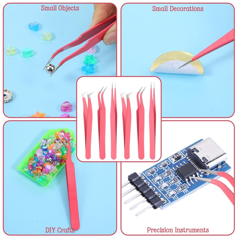 2pcs × red straight tweezers, 2pcs × red curved tweezers, 2pcs × red bird-billed tweezers