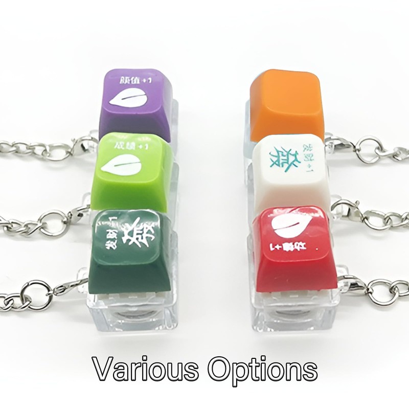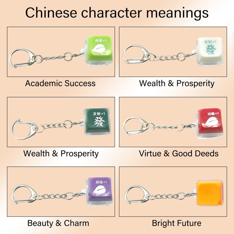 - 2.6 Color LED Glow &Feng Shui Blessings: Each keychain lights up in colors with a soft, calming glow.Every keychain includes a removable keycap with a Chinese character(except the orange one). White and green represent Wealth & Prosperity, light green for Good Academic performance, red for Virtue & Good Deeds, purple for High Beauty, and orange for a Bright Future.Place on desks, shelves, or keyboards to boost positive energy flow (Feng Shui)
