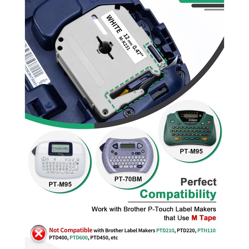 - These replacement for brother m-k231 label tapes are compatible with Brother P touch Label Makers: PTM95, PT-M95, PT-90, PT-70BM, PT-85, PT-80, PT-70, PT-65, PT-45M, PT-55, PT-55BM, PT-55S, PT-65SB, PT-65SCCP, PT-65SL, PT-65VP, PT-70BBVP, PT-70BMH, PT-70HK, PT-70HOL, PT-70HOT, PT-70SP, PT-70SR, PT-80SCCP. NOT compatible with Brother PT-20, Vixic M960 Label Maker (Can not work with Brother P touch TZe Label Makers, such as pt-d210, pt-d220, pt-h110, pt-d400, pt-1880)