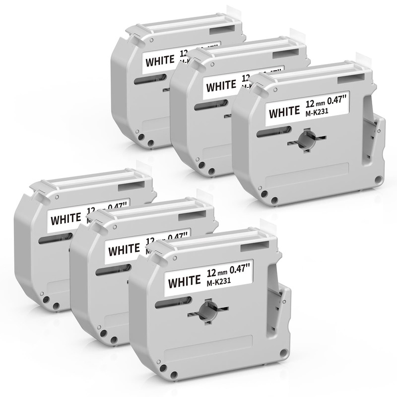 - Package includes: 6x Compatible with brother M tape ptouch label tape M231 MK231 M-K231 M-K231s. Color: black print on white tape. Each Size: 1/2 inch×26.2 feet (12mm x 8m)