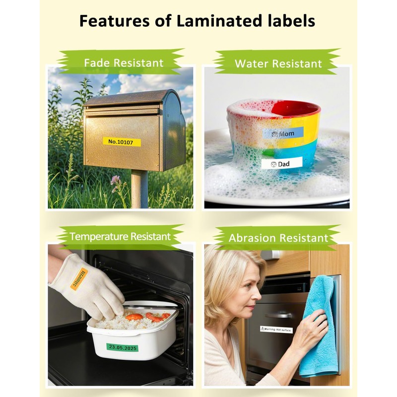 - Durable indoor or outdoor labels:P Touch label maker tape is standard laminated durable and strong adhesive tz tape.So the ptouch tapes are waterproof, wear-resistant, temperature-resistant, oil-resistant, stain-resistant,and does not fade or fall off.