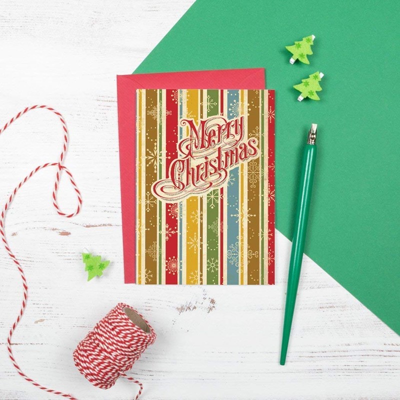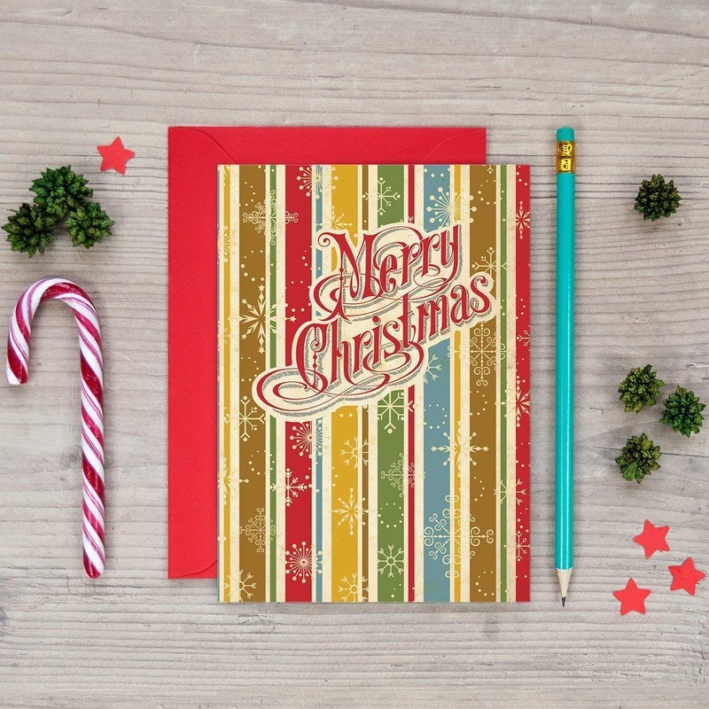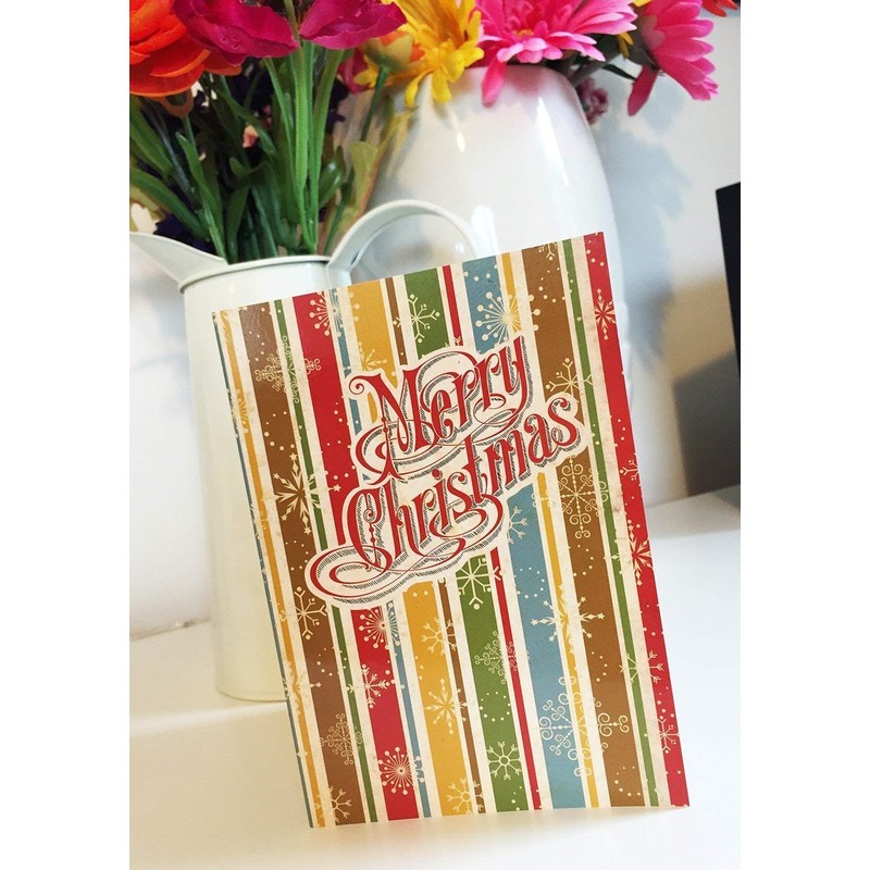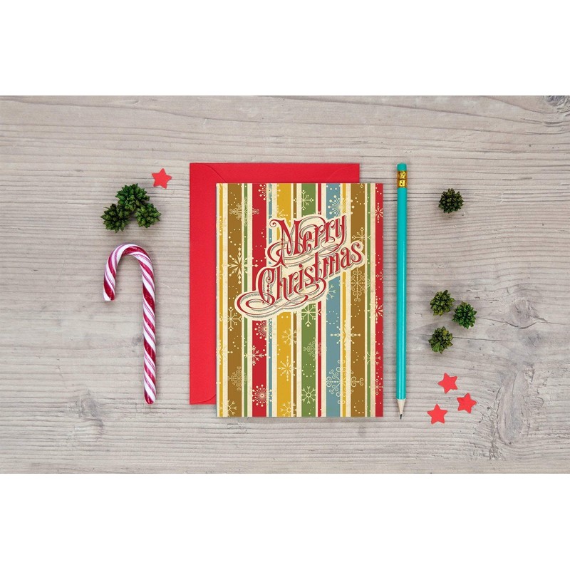 The cards feature a beautiful retro multi coloured Christmas design with a simple Merry Christmas on the front of the cards, perfect for those who appreciate all things vintage and retro.