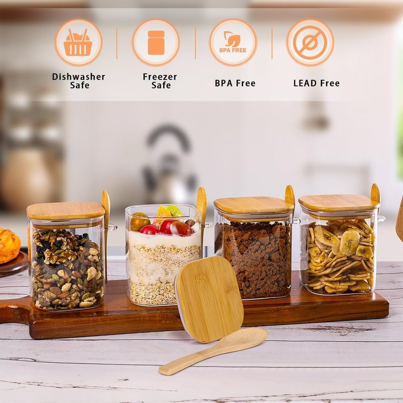 • Durable Quality - The jars with spoons and lids made with high-quality thick glass. Includes wide mouth wood lid with silicone ring for safe and tight seal to keep the food fresh at all time.It is easy to wash, simply wash it under warm water or throw them in the dishwasher. The bamboo lid and spoon can be wiped with cloth.