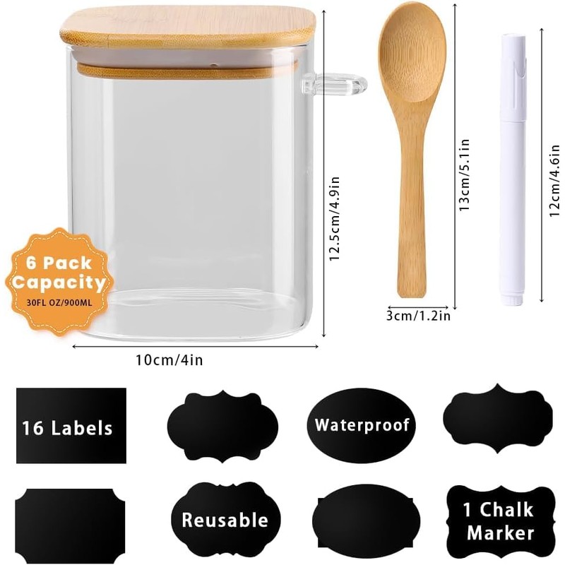 • Set of 6 Glass Jars with Spoons and Lids - This overnight oats jars set includes 6 airtight glass jars (503ml/17 oz, 4 x 4.9 inches) with bamboo lids and spoons, 16 reusable chalk labels, and a white marker. Ideal for storing and preserving a variety of ingredients including preserves, jams, chutneys, rice, sugar, flour, tea, coffee, spices, biscuits, etc.