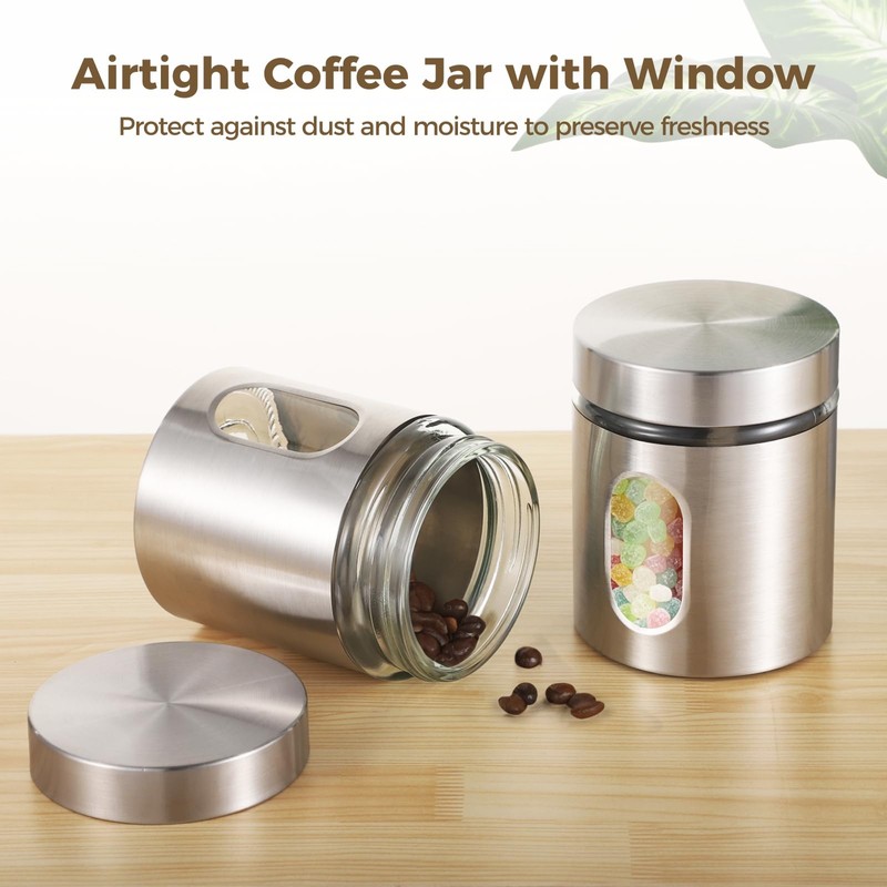 6-Pack Stainless Steel Kitchen Countertop Jar Set with Glass Clear Window and Airtight Lids for Food Storage and Organization Set for Coffee, Spices, Cereals, Flour and Other Foods (20 Ounces)