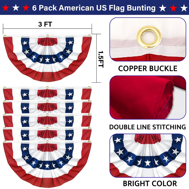 - 😍American Flag Bunting: 6 PCS 1.5×3 feet American Patriotic Bunting Flags are made from high-quality polyester and feature precision stitching. American flags are a stunning display of patriotism and a great way to appreciate the beauty of the USA.