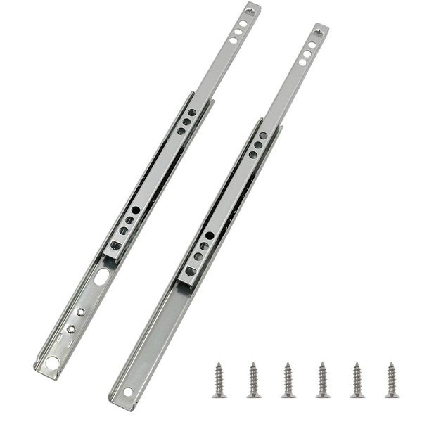 "Specification Color: Silver Tone. ? Finish: Zinc Plated. Material: Cold Rolled Steel. ? Feature: 2 Sections, Two Way. Dimension ? Total Size: 370mm/14.5 inch. Folded Size: 214 x 17 x 10mm/8.43 x 0.67 x 0.39 inch.(L*W*H) Package Includes: 6 Pairs x Drawer Slide(Mounting Screws are included here). The 17mm rail is a two-way rail, the inner rail is not removable. How to install 1. Slide the drawer guide to expose the mounting hole. 2. The narrower part screws to the inner side of the ""sidewall"" with the wood screws. 3. The wider part slides into a groove on the drawer side and is attached by one of the machine screws passing through a hole from inside the drawer and screwing into the tapped hole in the wider slide part. Note: There will be a hole in the drawer to block the screw, which will not affect the use."