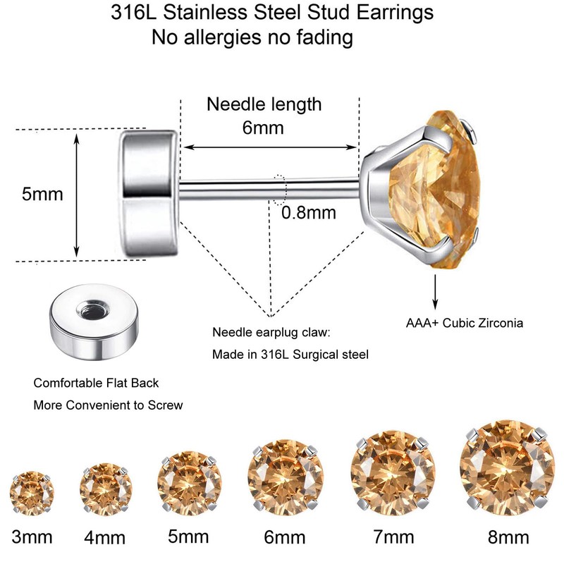 6 Pairs Stud Earrings Set, Hypoallergenic Cubic Zirconia Earrings 316L Stainless Steel CZ Earrings 3-8mm, Cubic Zirconia