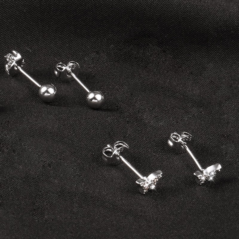 - White Gold Plated Stud Earrings Set: You will get 6 pairs white gold plated small stud earrings. Specifically, 1pair butterfly CZ stud earrings (0.15"), 1pair ball stud earrings (0.15"), 1pair triangular stud earrings (0.2"), 1pair quatrefoil blue stud earrings (0.25"), 1pair square CZ stud earrings (0.27"x0.15"), 1pair dark blue CZ stud earring (0.21"). Each pair of earrings comes with one pair butterfly metal earring backs and one pair silicone earring backs.