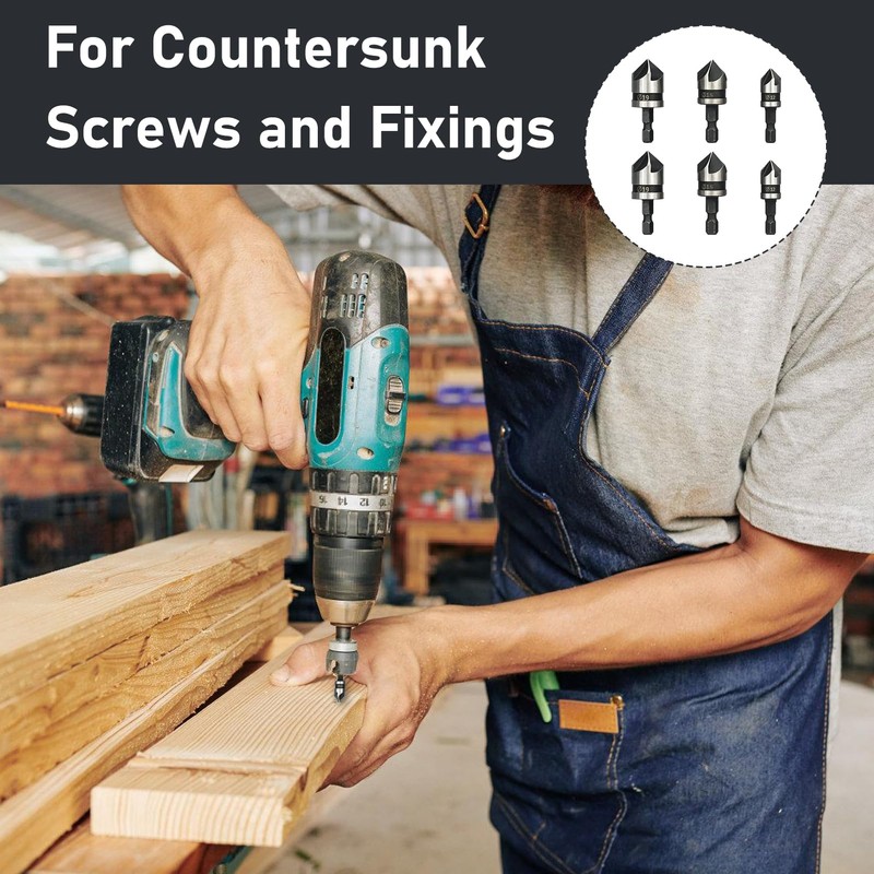 - Upgrade your tool kit with this 6-piece Countersink Drill Bit Set—precision-engineered to deliver clean, professional results across a wide range of materials and applications. Made from high carbon steel and treated with black oxide for added durability, these 5-flute 90-degree chamfering bits are your go-to solution for all types of woodworking and soft metal projects.