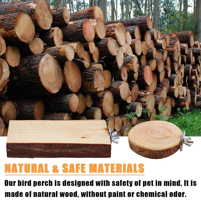 - NATURAL & SAFE MATERIALS - Our bird perch is designed with safety of pet in mind, It is made of natural grapevines wood and soft fir, without paint or chemical odor, it is safe, providing a safe and natural standing spot for your birds. The material of the end of metal rod is metal alloy with a small amount of zinc. If you mind, please confirm before purchasing