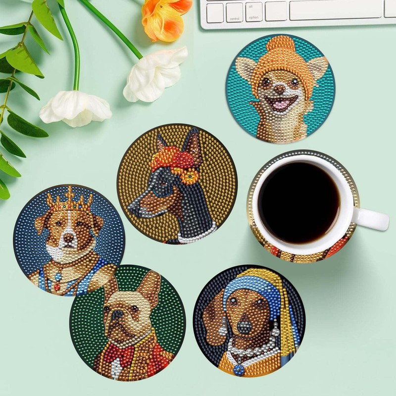 6 Pcs Dogs Diamond Paintings Coasters with Holder for Adults Beginners, Round Full Drill Diamond Art Craft Supplies(Dogs QLBD-09)