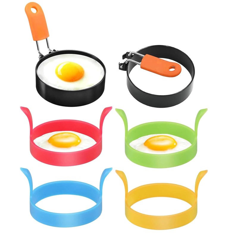 - What You Get: You will get 4 different colored silicone egg rings and 2 stainless steel fried egg ring, 1 color random silicone brush and white egg white filter. Let you feel pro chef when using this egg rings for frying, and poached egg moulds are practical and necessary cooking tools for your home.