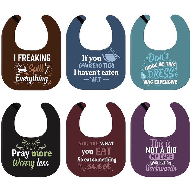 - Interesting and Distinctive Design: there are 6 funny sentences printed on the surface of our bib for adults, such as DON'T JUDGE ME, THIS DRESS WAS EXPENSIVE, PRAY MORE, WORRY LESS, etc., paired with exquisite patterns, eye catching and unique, which can easily resolve the embarrassment of difficult meals and bring a relaxed atmosphere