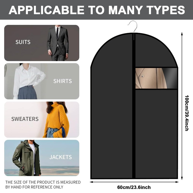 6 PCS Garment Covers, 60 x 100cm Dust-proof Clothes Covers, Moth Proof Coat Bag with Zip, Translucent Waterproof Anti-mite Breathable Suit Protector for Wardrobe Storage, Travel (All Black)