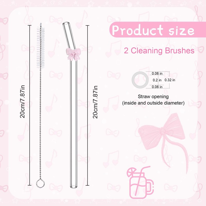 - Pink Glass Straw with Bow:Our glass straw set includes 6 glass straws with design bow and 2 long handle cleaning brushes, shatter resistant surface and a bow design on the curved part, practical and beautiful, cut