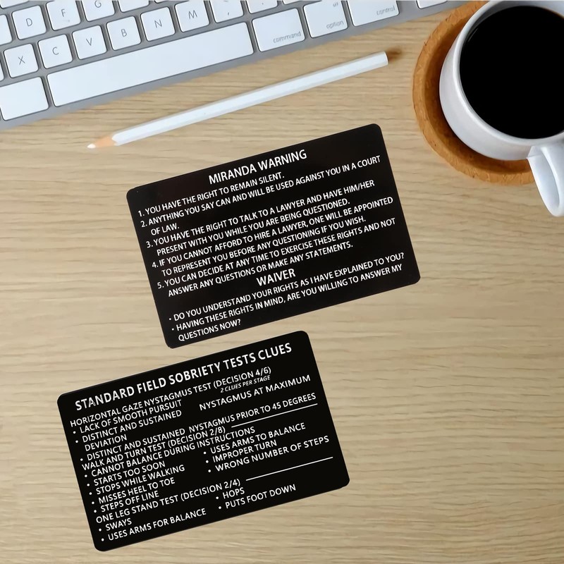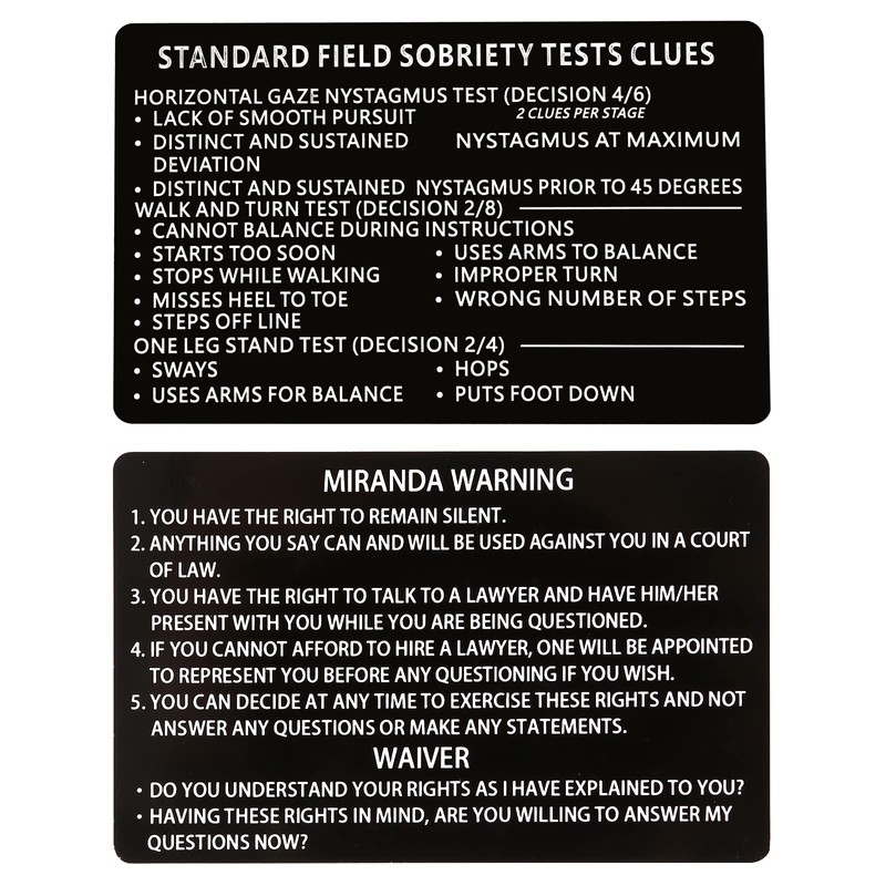 - A laser dual-sided sturdy and reliable black aluminum card with the Miranda Warning with the waiver of rights depicted on one side and Standard Field Sobriety Test clues depicted on the other.