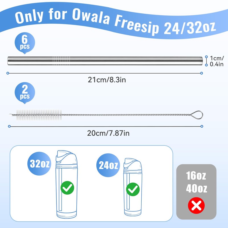- Perfect Fit for 24oz 32oz cup : These metal replacement straws are precisely engineered for the Owala freesip Kids Water Bottle 24oz 32oz, ensuring a secure fit with the lid and smooth performance with every sip.