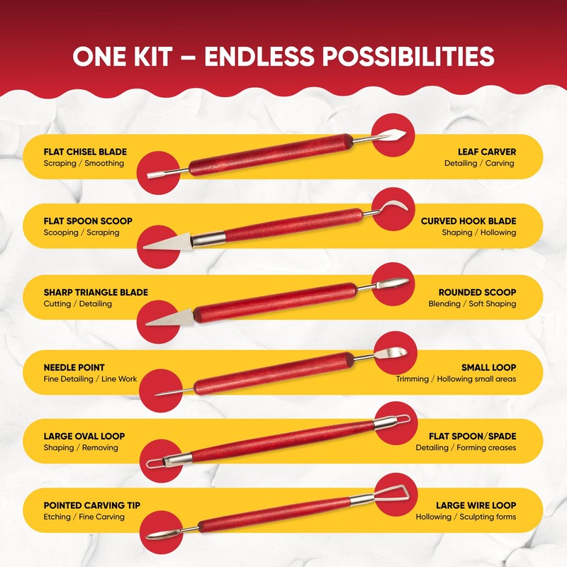 - Double-Sided Design: This pack contains 6 double-ended tools, offering 12 different shapes and sizes. These versatile clay modeling tools give you the flexibility to carve, shape, smooth, and add fine details to your pottery and sculpting projects with ease and precision.