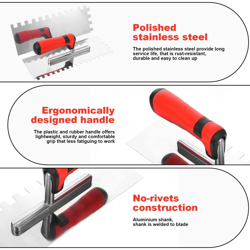 - Tool Size: Our tile tool set includes three square notched trowels measuring approximately 11.02" x 3.94" (28 x 10 cm), each with a different notch size, approximately 0.16" x 0.16" (4 mm x 4 mm), approximately 0.31" x 0.31" (8 mm x 8 mm), approximately 0.47" x 0.47" (12 mm x 12 mm), and also includes a rubber grout trowel measuring approximately 9.5" x 4", and two grout sponges measuring approximately 5.9" x 3.74" x 2".