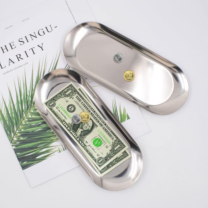 The silver tip trays is made of high-quality stainless steel. This ensures a rust-free and sturdy design, capable of withstanding daily use without succumbing to ordinary bumps and knocks. The elegant silver color and lustrous finish of the tray make it a stylish addition to any setting, elevating the overall ambiance. Its smooth edges not only enhance safety but also contribute to its fashionable appearance.
