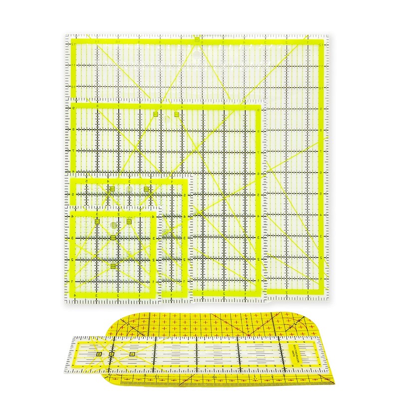 - Essential Set: Includes 4 acrylic quilting rulers (4.5"X4.5", 6"X6", 9.5"X9.5", 12.5"X12.5") with transparent design for easy fabric alignment. Perfect for beginners and advanced quilters. Offers clear views for precise cutting, measuring, and drawing. Compatible with rotary cutters for accurate cutting.