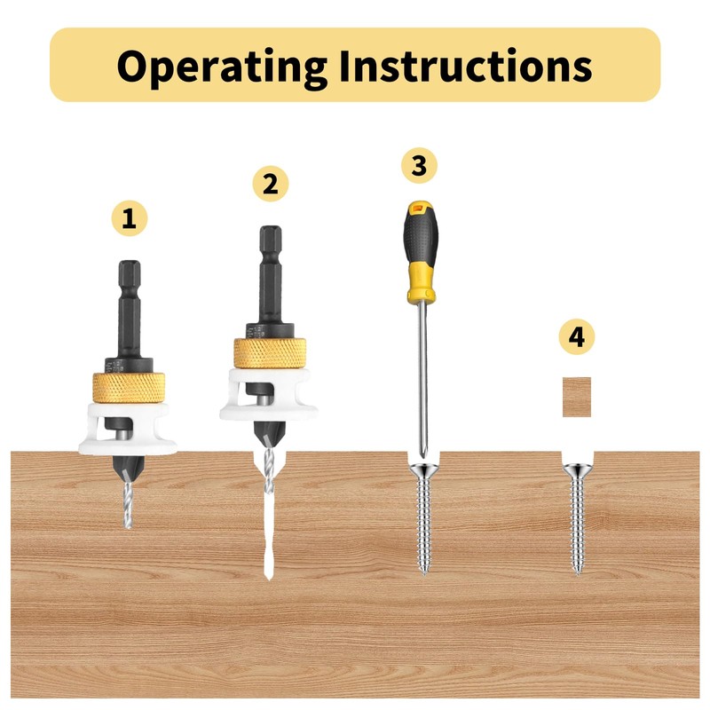 • Size: the 6-piece countersunk drill set includes 4 different sizes: 2.8 x 8 mm, 3.2 x 8 mm, 3.5 x 10 mm, 4 x 10 mm (all with 3/8 inch 82° countersunk holes and 1/4 inch hex shanks) and a hex key
