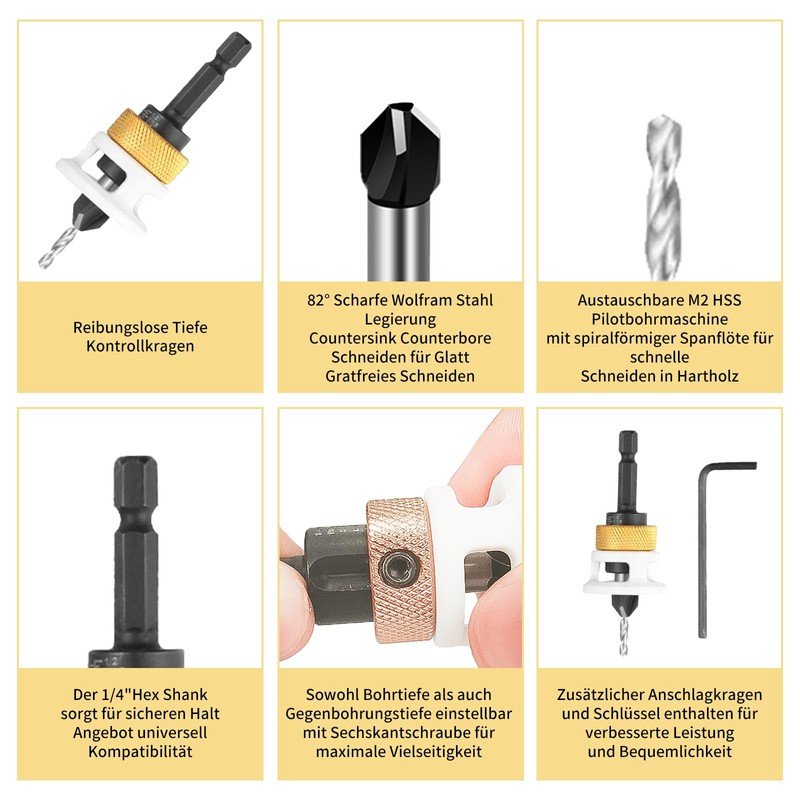 6-Piece Countersink Drill Bit Set, Countersink with Depth Stop, Countersink Wood Drill Bit with 1/4 Inch Hex Shank, Made of HSS-M2, Precise Drills, for Wood Processing