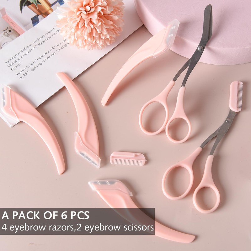 6-Piece Eyebrow Trimmer Set: 2 Eyebrow Scissors with Combs, 4 Curved Stainless Steel Razors—Essential Beauty Tools for Men and Women