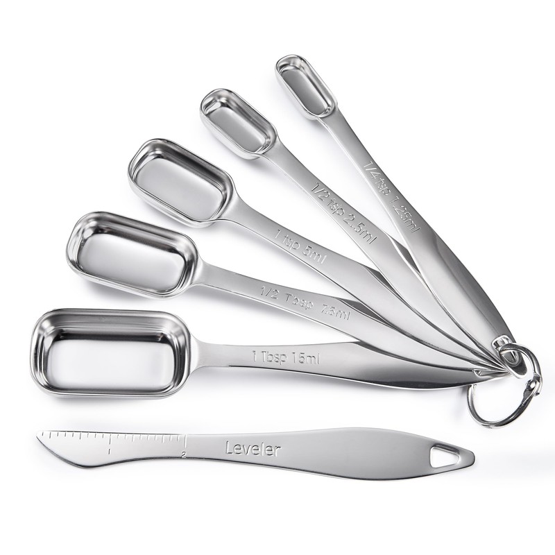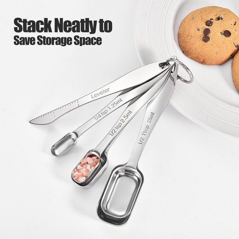 - Does Doosu tablespoon set include a leveler for precise measuring? This stainless steel measure spoon set consists of 1/4tsp, 1/2tsp, 1tsp, 1/2tbsp, 1tbsp and an leveler. By sliding off excess ingredients from the top of each spoon, the handy leveler helps you avoid common mistakes like over-packing flour or spices, improving consistency in your cooking and baking. For beginners, this means fewer recipe mistakes, better texture in baked goods, and more balanced flavors in your dishes.