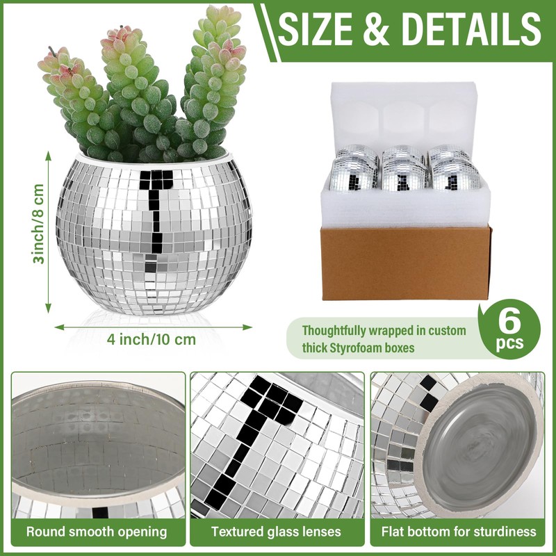 - Package Includes: you will get 6 pieces of silver disco ball flower vases, which are suitable for wedding, events and home decoration, the size of them are about 3 x 4 inches/ 80 x 100 mm; And we have improved our packaging; Each disco vase has safely packed in layers of foamed polystyrene and heavy cardboard to avoid possible damage