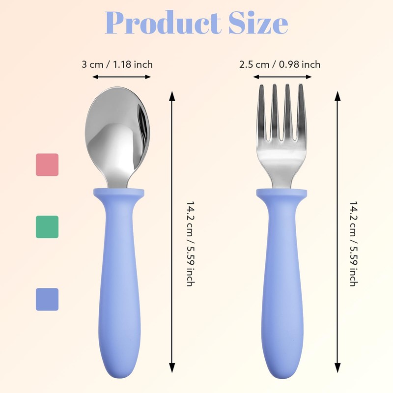 - 【Perfect Size】Our toddler spoon and fork set is just the right size for your child's little hands. The cutlery set is approx 5.4 x 1.2 inch, making it easy for your child to self-feed.