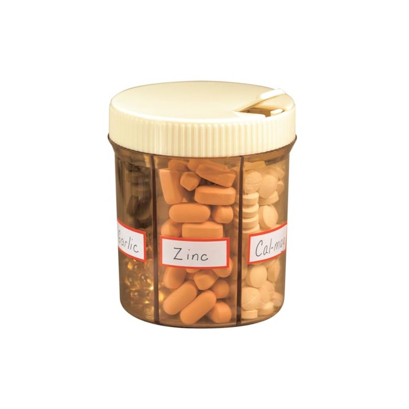 14 day pill holder secures pills inside removable, plastic snap-shut compartments that stay in place under vinyl sleeves. The pill holder has morning, Noon, Evening and bedtime sections; measures: tapestry 4 9/16x 1 5/8x 7 3/8. Black 4 5/8x 1 7/8x 7 1/2.