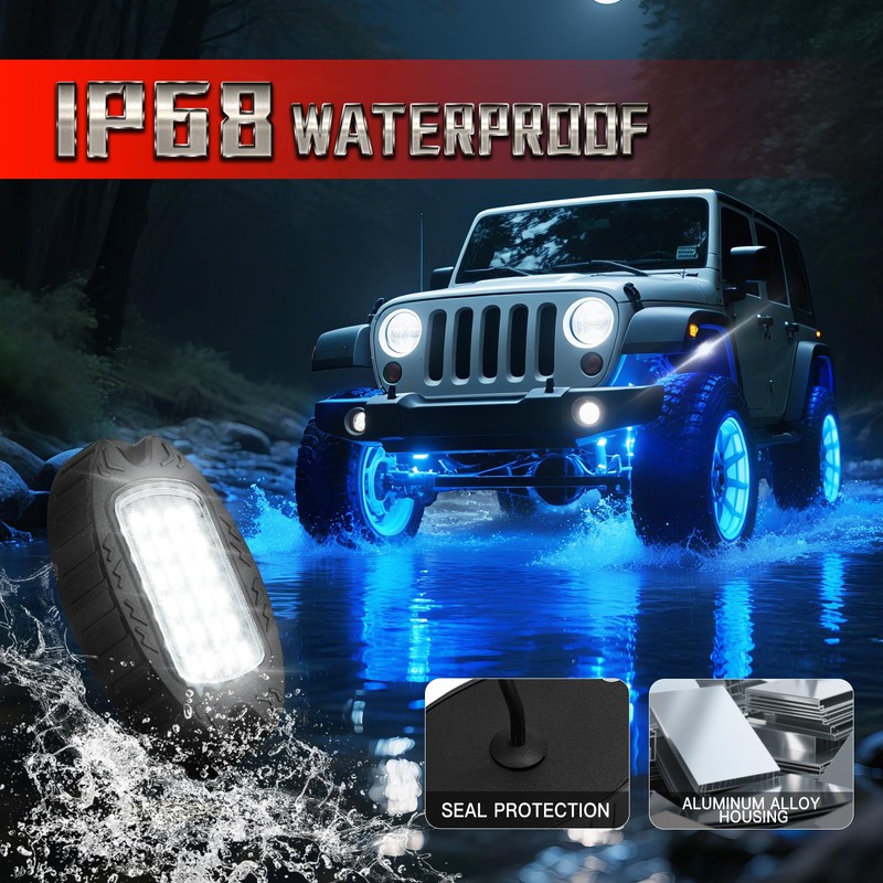• IP68Waterproof Metal Housing:RGBW Rock Lights Waterproof Adopting a fully sealed IP68 waterproof rated hard metal casing with waterproof/rustproof/anti-bumping/high and low temperature resistant design ensures its stable operation in extreme environments such as high temperatures, torrential rains, mud, rivers or snow. The base is made of high-strength aluminum alloy, which is stronger and more durable than plastic shells, and can easily cope with off-road bumps and impacts.DARKGLORY RGBW rock lights for Truck can operate normally in any environment