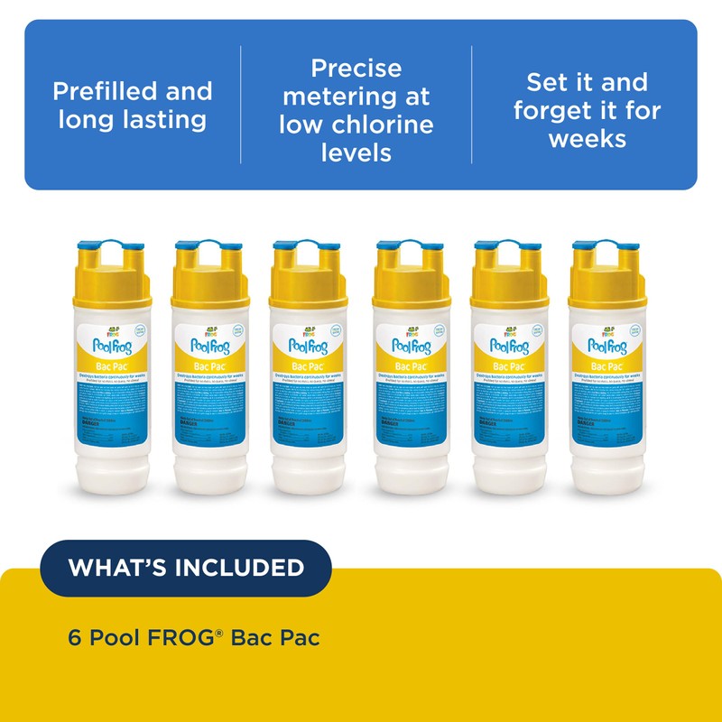 - FROG Bac Pac is prefilled – no need to measure or handle chlorine, making it no guess, no mess, and no stress. Simply replace Pool FROG Bac Pac every 1-3 weeks as needed. This bundle comes with 6 Bac Pacs for weeks of clean and clear water!