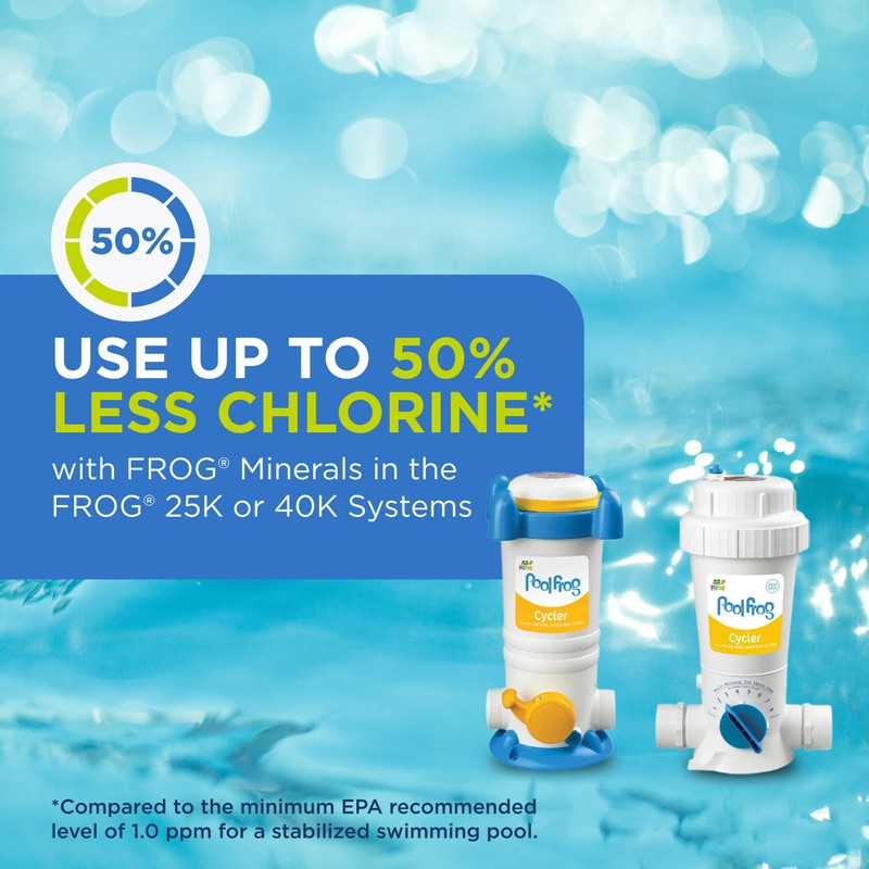 - Pool FROG reduces chlorine use up to 50%*. Less chlorine means water is easier on skin, hair, swimsuits, and surfaces. FROG Sanitizing Minerals condition water for softness and help keep water balanced by absorbing acids, so water feels more comfortable