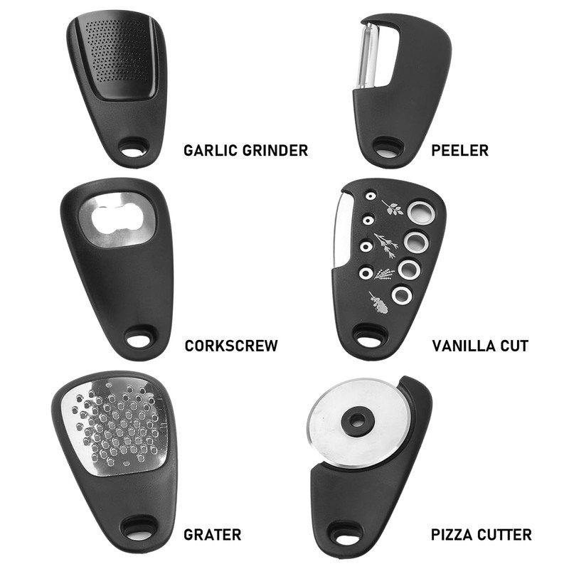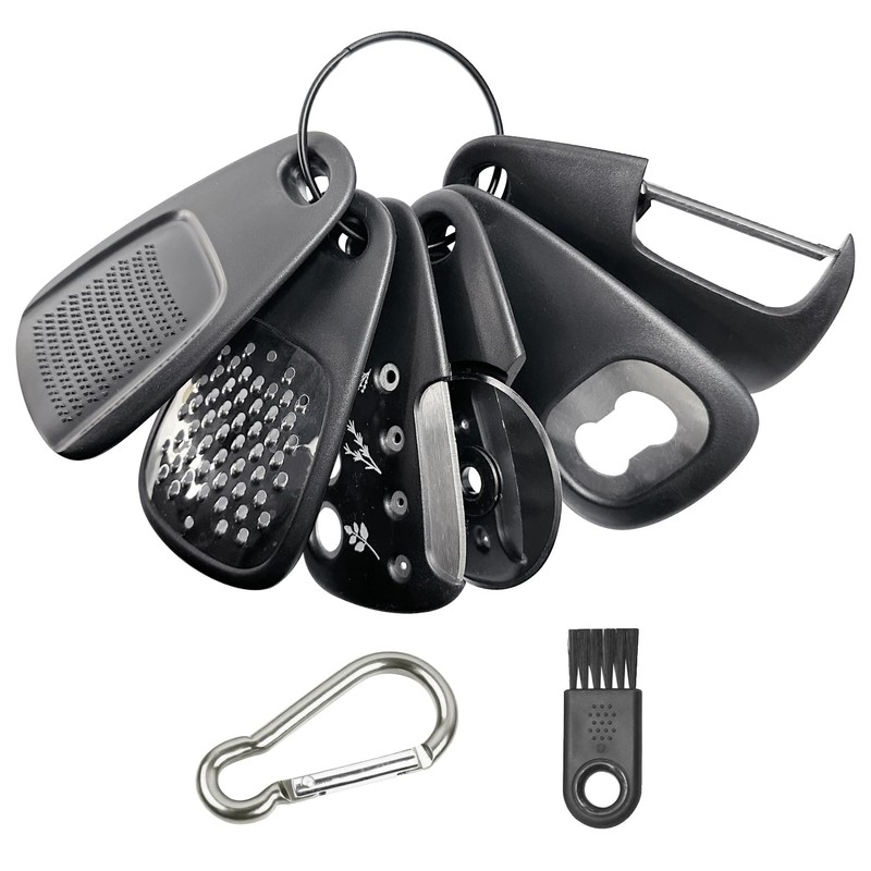 6 Portable Kitchen Tools, 1 Carabiner, Fruit and Vegetable Peeler, Cheese Slicer, Bottle Opener, Garlic Sicer, Ginger Grinder, Gerb Stripper, Pizza Cutter, Kitchen Tools, Cooking and Baking.