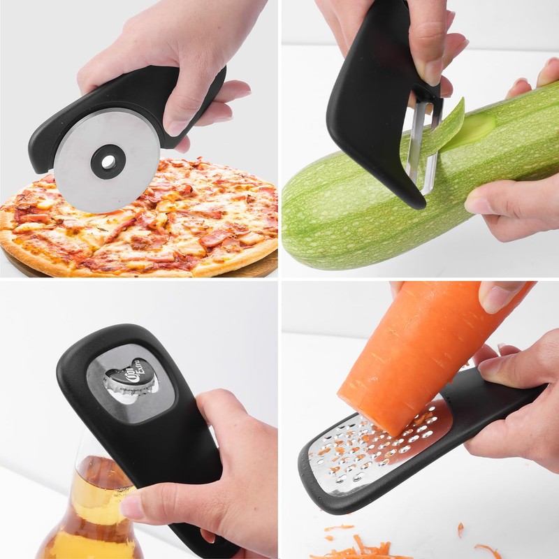 - ✔【Comprehensive Kitchen Tool Set】You will receive 6 kitchen gadgets including 1 grater for cheese, vegetables, chocolate, 1 garlic or ginger grinder; 1 pizza cutter/wheel for pizza and flatbreads; 1 bottle opener ; 1 pc rotary peeler for vegetables and fruits; 1 pc leaf herb peeler, and 1 pc silver carabiner.
