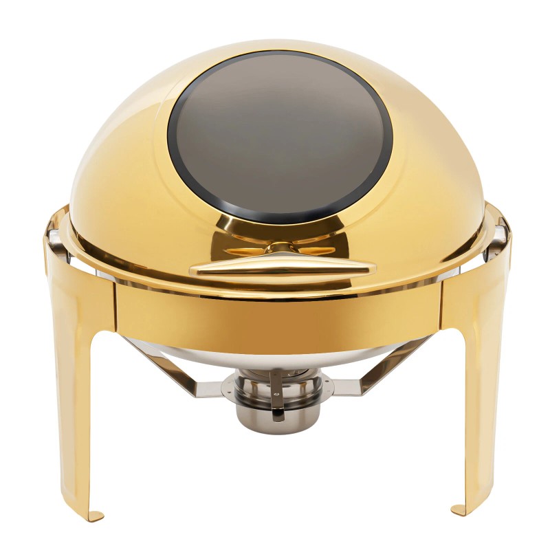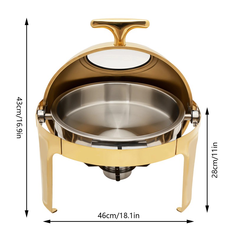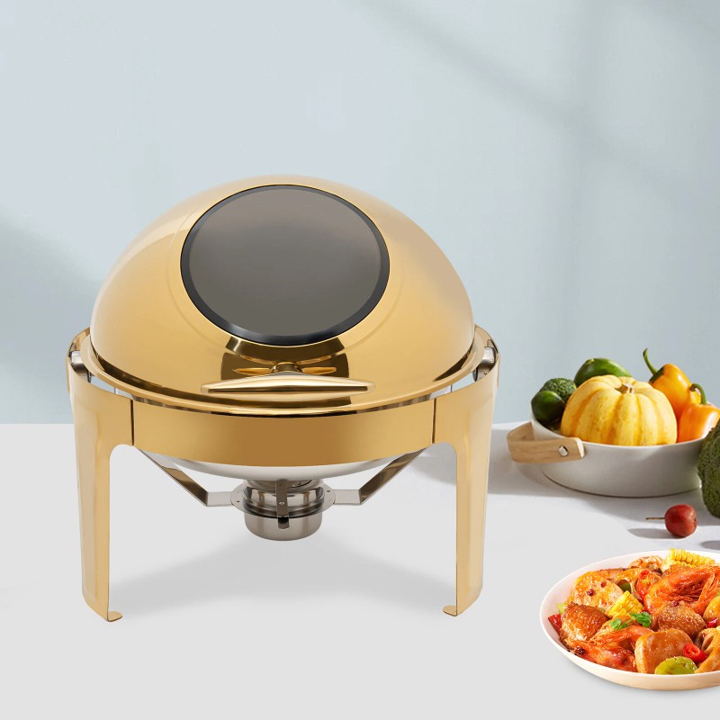 The round chafing dish made of 201 stainless steel combines practicality and beauty, making it a great aid for serving and keeping food warm. The visible design allows you to easily see the condition of the food inside and the T-shaped non-slip handle ensures effortless opening of the lid, which is convenient and practical, enhancing your life experience.
