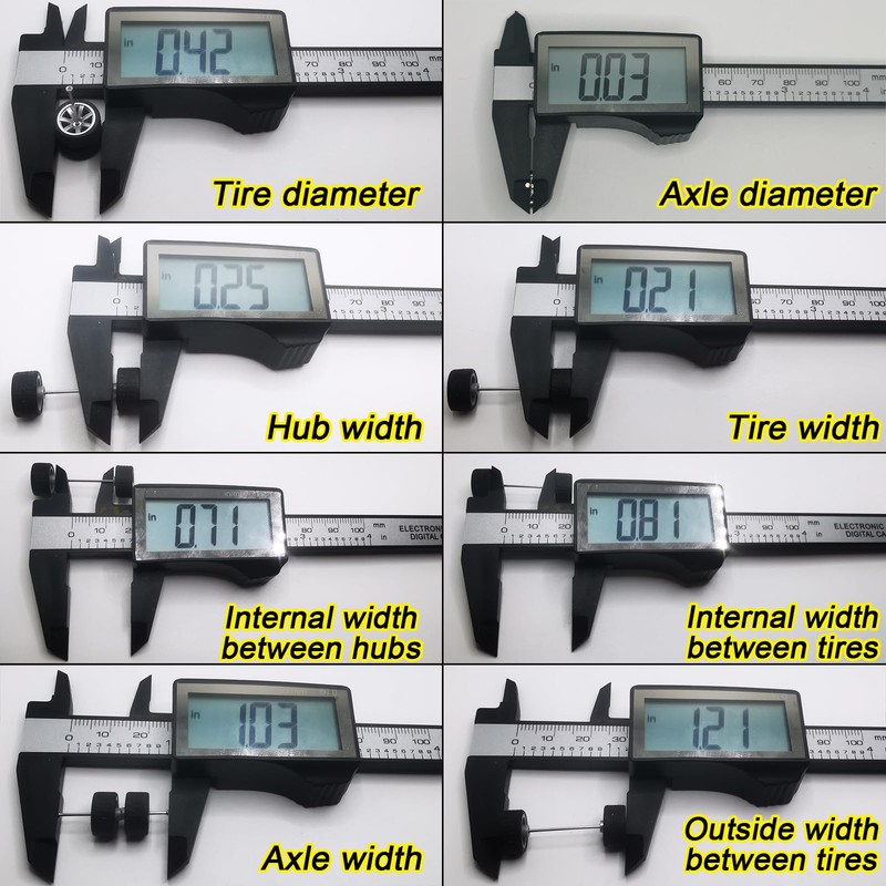 - ➤Rubber Tires - 1/64 wheels with black rubber tires and plastic hub. 1/64 scale wheels has a diameter of 0.42in/10.8mm, wheel base inner length 0.71in/18mm, wheel base outer length 1.21in/30.7mm. These real riders tires are designed for 1 64 scale cars, so they are very Precise, it fits the wheels of model cars perfectly. These tires are not toys and are not suitable for unaided use by persons under 14 years of age