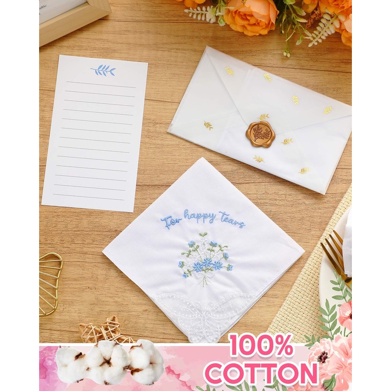 - Exquisite Embroidery Design: the butterfly lace border on our bridal handkerchiefs, adorned with the blue flower pattern and exquisitely embroidered with the phrase "For Happy Tears" in blue, adds an elegant flourish to these everyday items; This makes them not only good accessories for any special occasion like weddings or parties but also adds an elegant and romantic touch to the atmosphere