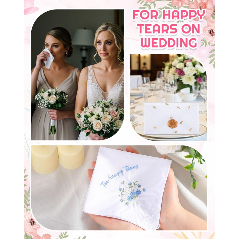 - Suitable Size: each bride embroidered handkerchief decorated with exquisite phrase "For Happy Tears" and intricate floral designs; With dimensions of 11.42 x 11.42 inches/ 29 x 29 cm, ensuring that the style and functionality blend seamlessly for any occasion