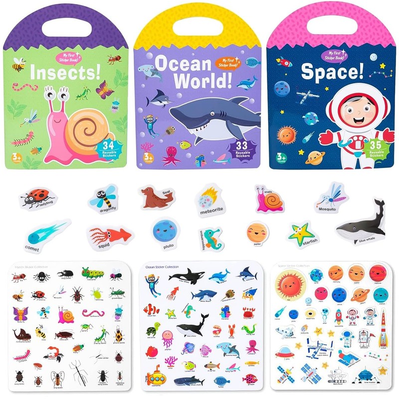 - Reusable Sticker Book for kids: Our jelly stickers are made of durable silicone material, which can washable, no smell and reusable, safe for children. Includes 6 set sticker books: vehicle & animal & ocean & dinosaur & insect & space, Your kids can place the removable stickers anywhere in the scene book to create their own story, Also can be pasted on smooth places such as water cup, laptop, book, fish tanks, windows, mirrors etc.
