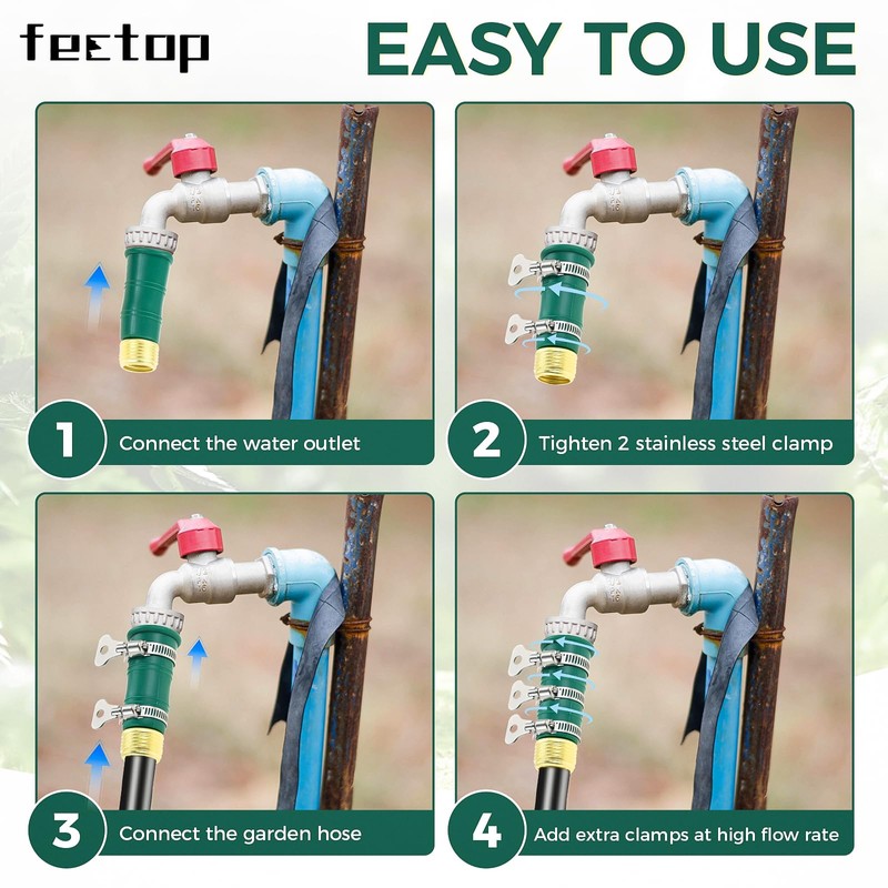 • 【Universal Connection】The brass connector is suitable for most standard 3/4-inch hoses, and the other end is a silicone flexible sleeve that can be connected to various faucets, nozzles, and even damaged faucets, spouts without threads. The diameter adjustment range of stainless steel clamp is 1.9 cm/0.75 inches -3.9 cm/1.5 inches