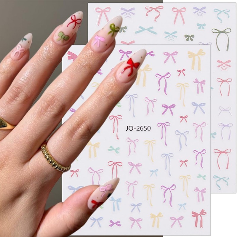 - Easy to Use: These colorful bow nail stickers design are self-adhesive and requires no glue, just remove sticker then stick this 3d nail sticker on your nail. Apply top coat gel to seal to make the stickers last longer