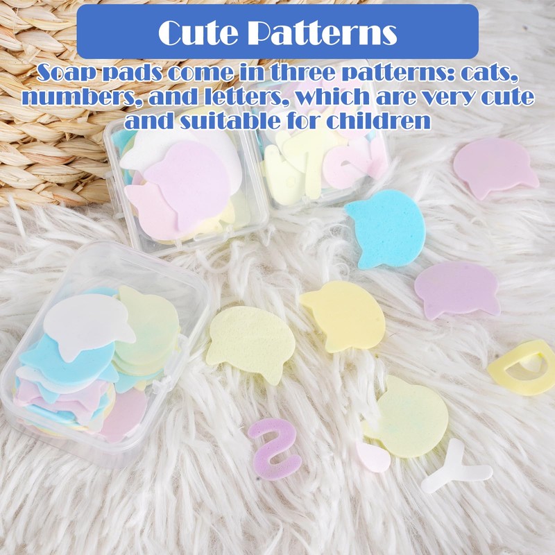 - [DIMENSION] The paper soap has 3 patterns: kittens, number, letter, and is in 3 rectangular boxes of 6.5 x 4.5 x 2 cm, and 3 square boxes of 4.5 x 4.5 x 2 cm. These travel gadgets are small and portable, so soap box can be easily put in a bag or bag. The outdoor soap is generously portioned and is therefore perfect for vacation, mini shower gel